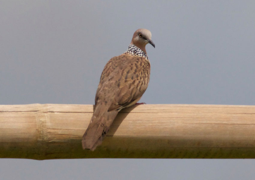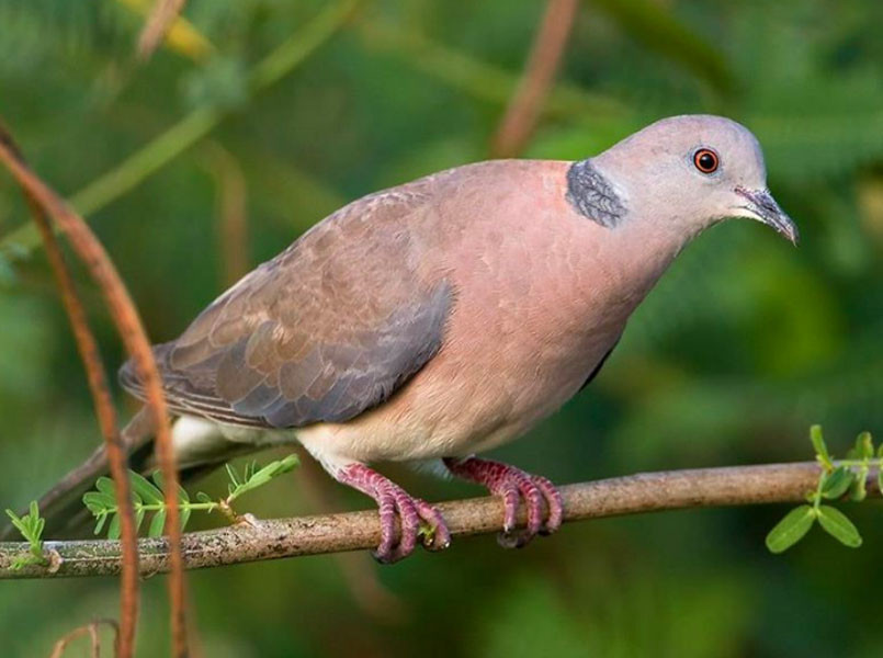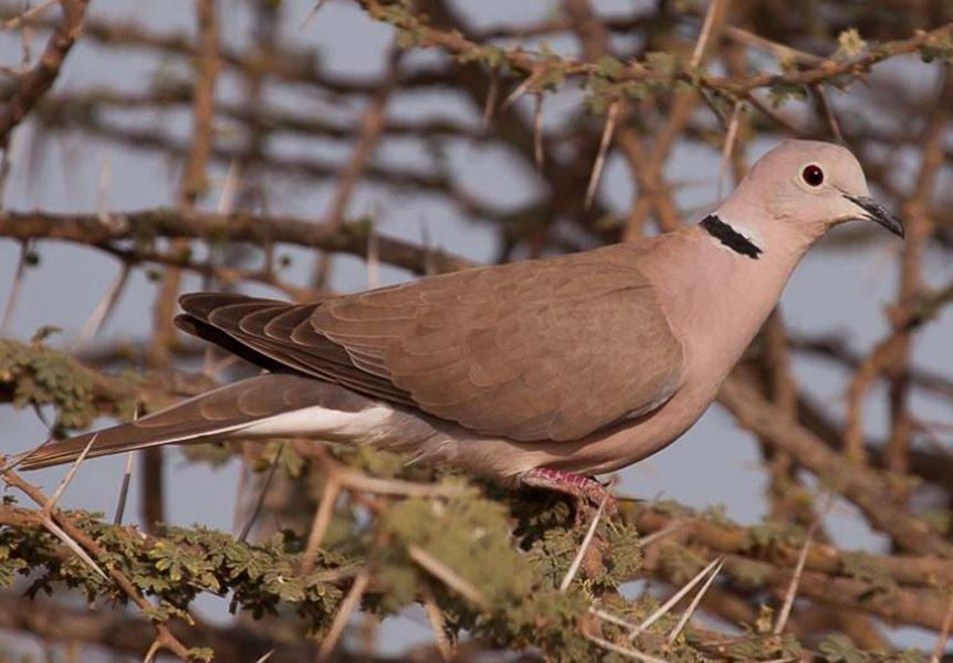 Head and neck: Head and neck pinkish grey; narrow half neck collar on hind neck black with white edg...