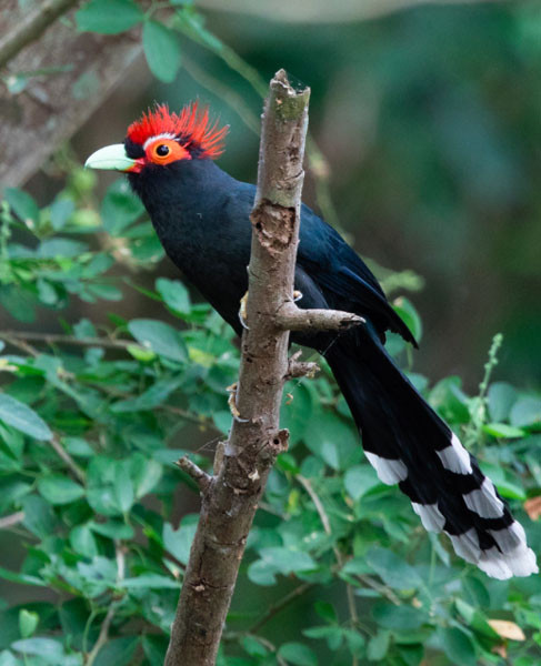 Head and neck: Nape and throat black; face and cheek red (male); Body: Overall strikingly black ...