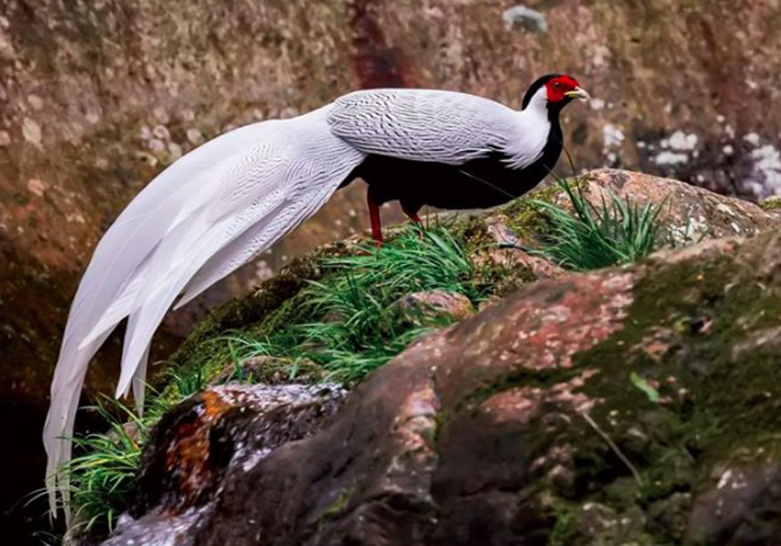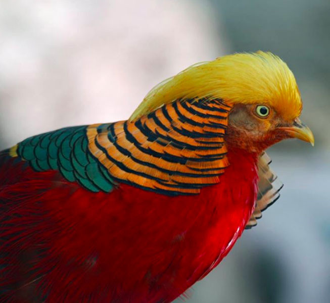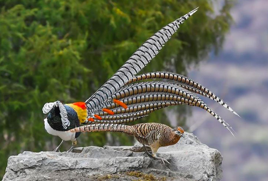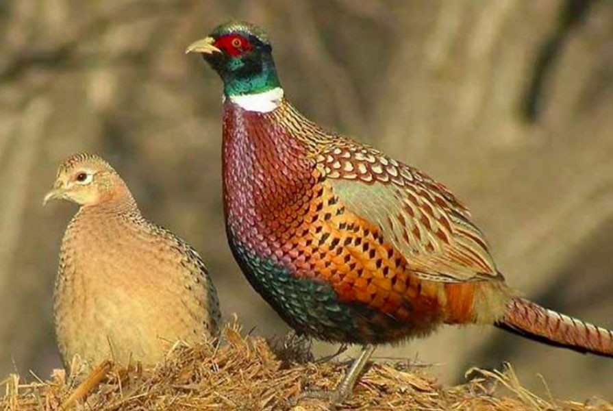 Males with flamboyant plumage and very long tail, females mainly brown with black bars; male 100-115...