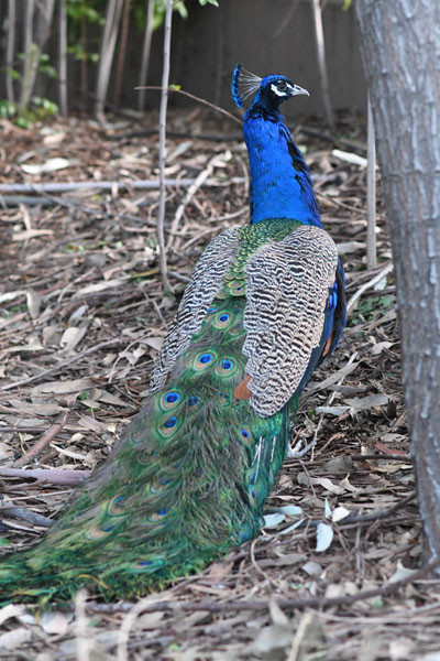 Head and neck: Head and neck mostly featherless, bluish white to blue; hind neck and neck with black...