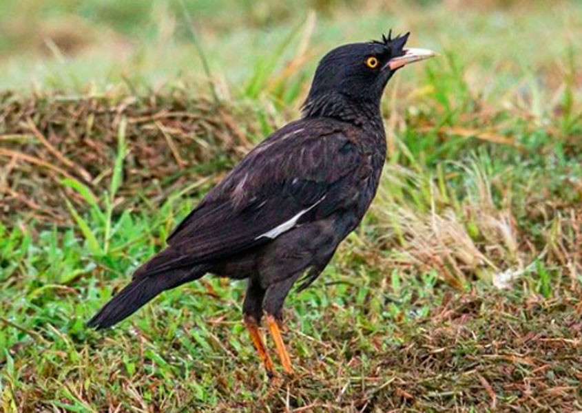 Head and neck: Elongated forehead feathers forming a conspicuous frontal crest; eye dull yellow to b...