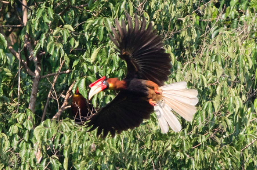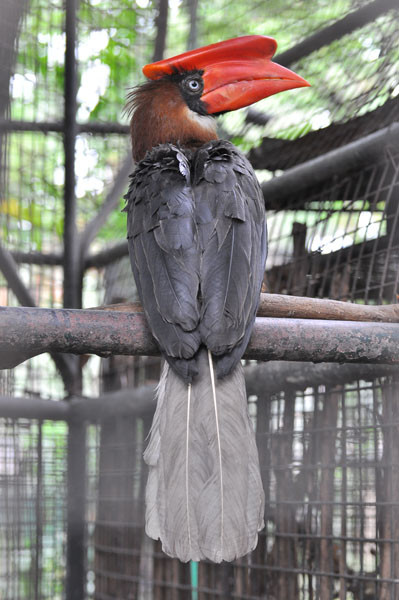 Head and neck: Head and neck rufous brown; casque and bill red; casque large and flat extending to a...