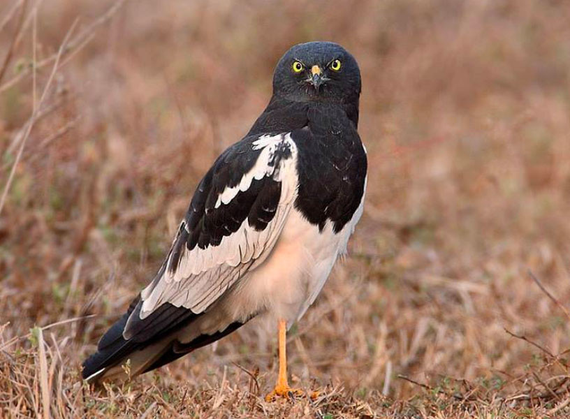 A medium Harrier; 43-50 cm Head and neck: Pied (black and white); head and throat (mal...