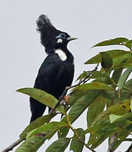 Head and neck: Long feathers on crown forms a tall crest; head and throat black with iridescent purple; white patch on lower ear coverts; eye brown; bill light yellow.