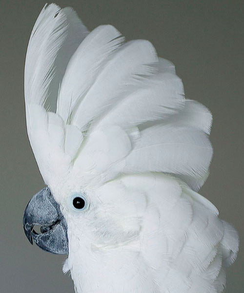 A medium cockatoo; 46 cm TL; 550g; sexes are alike in appearance. Head: Head white; bill strongly curved, dark grey; eye dark brown (male), brown or red (female); skin around eye (eye ring) light blue; crest long, curving backwards, white.