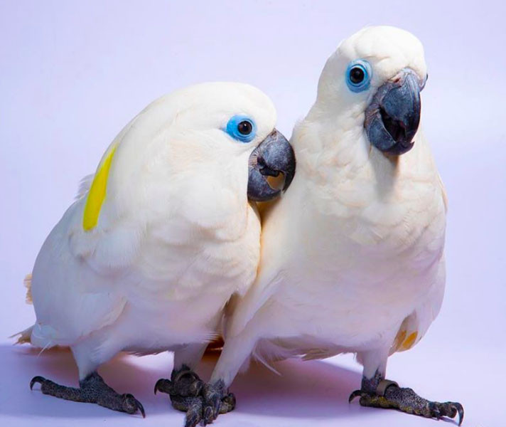 A large cockatoo; 44-50 cm TL; 500-570 g. Sexes are alike in appearance. Head and neck: Long backward curving crest yellow; skin around eye richer blue than any cockatoos; eye black or dark brown (male), reddish (female); bill grey.