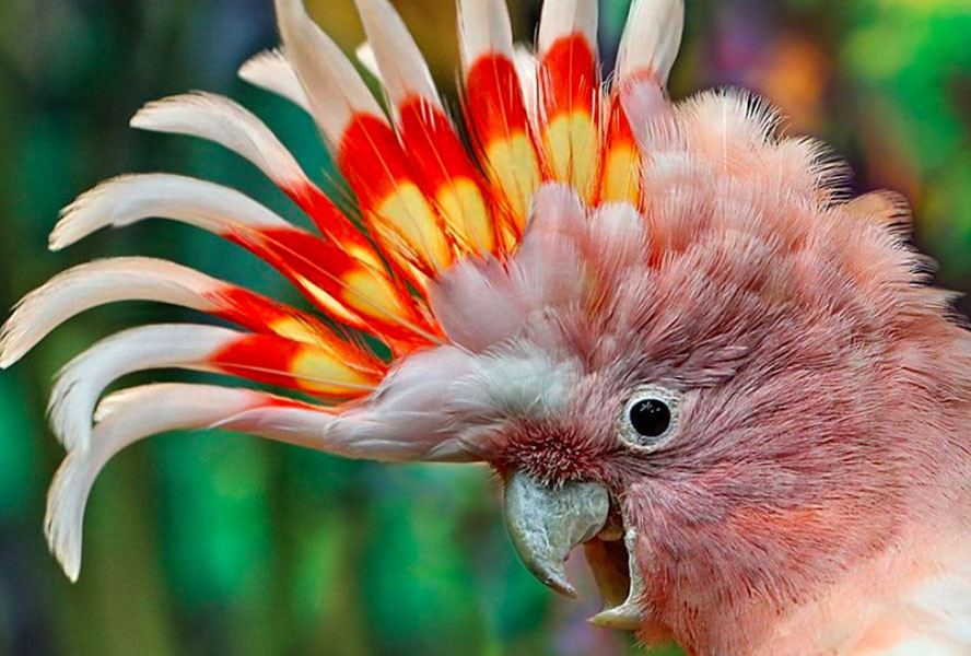 A medium cockatoo; 33-40 cm TL; 360-480 g.                                                   Head and neck: Head pinkish white; crest curving forward, white with broad red and orange band on lower part; eye dark brown (male), red (female); bill grey or black.