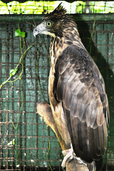 A medium eagle; 56-69 cm TL; sexes are alike in appearance. Head and neck: Covert on head and neck brown at base and dark brown at tip; crest is long (up to 7 cm) and composed of 4 to 5 feathers; eye yellow; bill light grey at base and dark grey at tip.