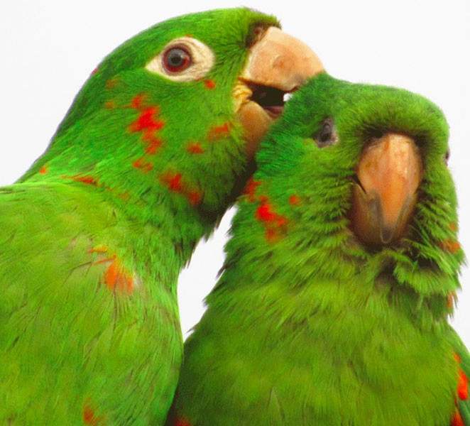 Head and neck: Head green; some red flecks on head, neck and throat; skin around eye greyish white; eye outer ring reddish brown, inner grey; bill light yellowish brown.