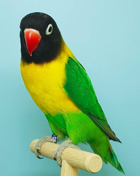 Head and neck: Head hooded black; skin around eye white; bill red. Body: Upper back, collar and breast yellow; back and wings dark green; primaries black; abdomen yellowish green. Limbs and tail: Legs and feet grey; tail green.