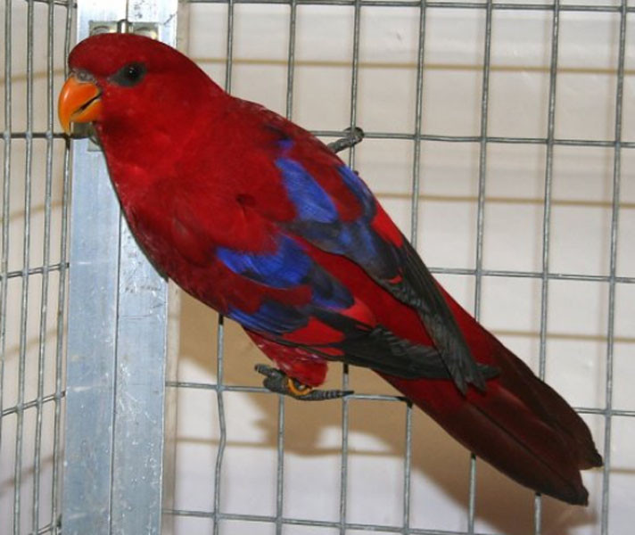 Head and neck: Head, neck, and throat red; skin around eye dark grey; eye reddish brown; cere dark bluish black; bill orange to red.