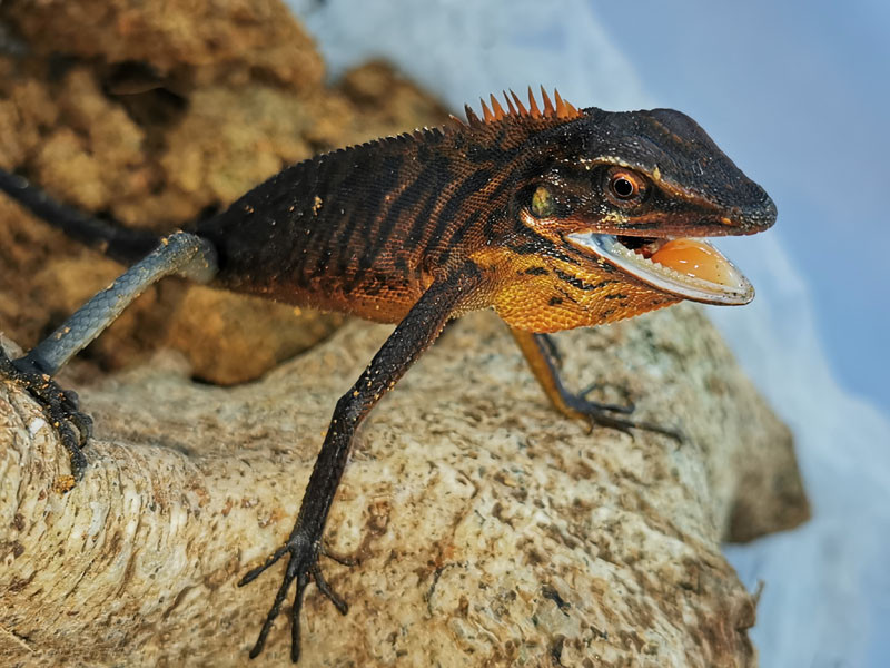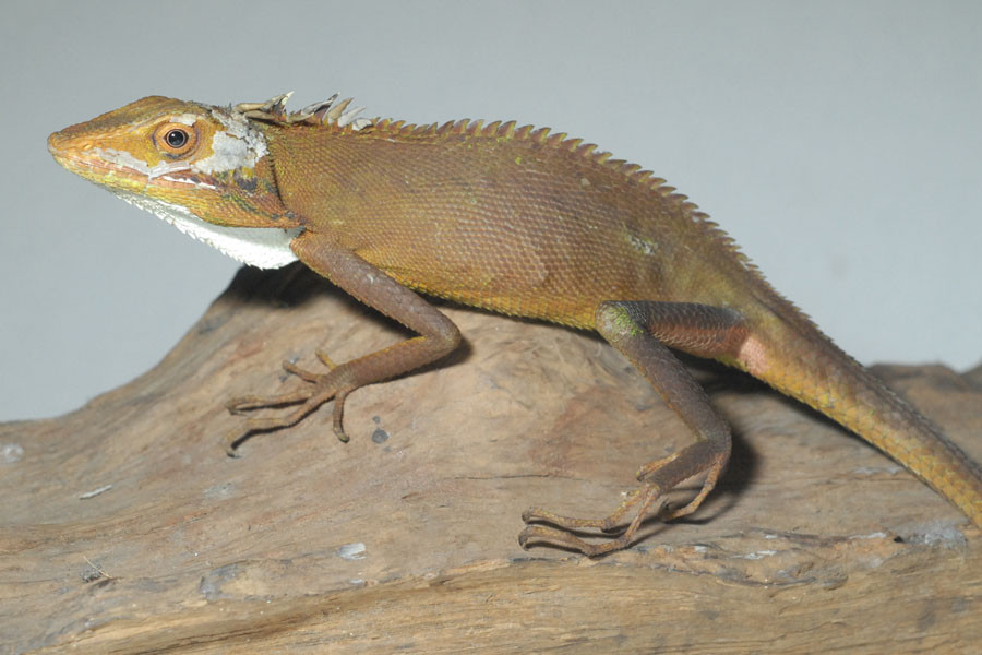 Head and neck: bright green but turns brown when agitated or stressed; rostral rectangular, small; dorsal head scales small, keeled; crest behind neck pointing upwards and backwards.