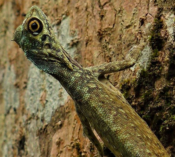 Head and neck: small; brown with scattered green, white, and black spots; dewlap (male) off-white.