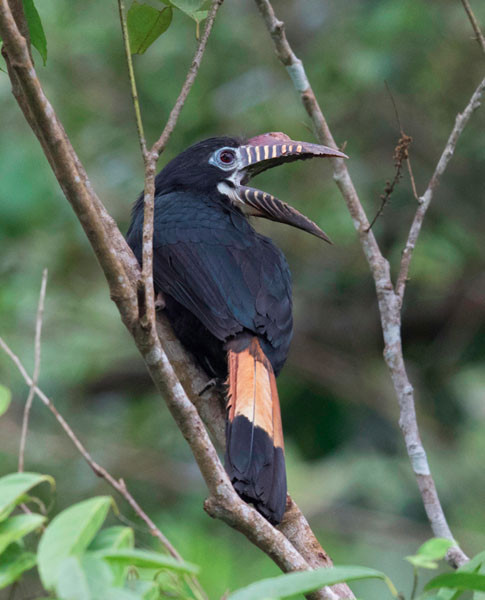 Small hornbill; 45 cm TL; sexes are different; prominent ridged bill. Head and neck: Head, and neck dirty white and washed with pale yellow (male); ear coverts (cheek) and lower throat black; bare skin around eye and on throat white; eye light brown to dark red; casque small with prominent ridges; bill and casque blackish maroon; female black overall except tail.