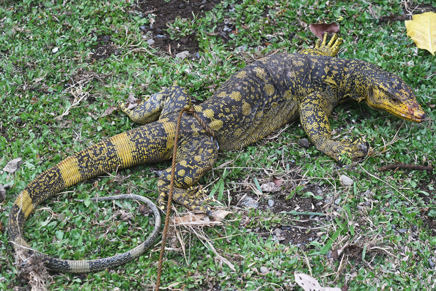 Head and neck: ; head robust, elongated; nostril slit-like; head scale heterogenous; dorsal of head black with yellow spots; Jaws and cheek yellow. Body: large, robust; Dorsal -constrasting black and yellow; black part with yellow spots and flecks; 766 cm SVL. Limbs and tail: Limbs mascular, same color as body; digits terminate with robust, recurved claws; tail alternating dark and yellow bands.