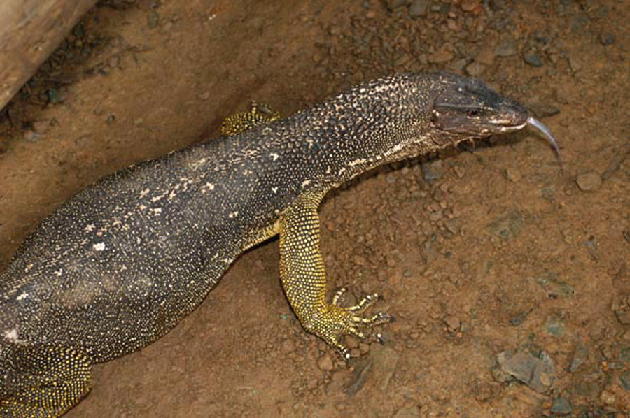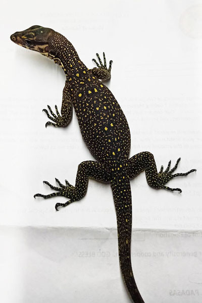 Dorsal - black, sometimes with four distinct or reduced transverse rows of spots, sometimes with dorsal stripe in the middle. Ventral - yellowish with black reticulated markings (Negros, Panay, Cebu) or yellowish with indistinctive dark bars or entirely black (Masbate, Ticao)