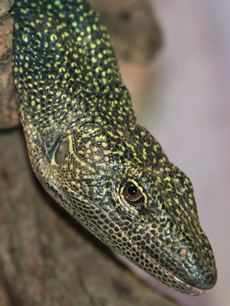 Head and neck: dark grey to black with yellow scales; black stripe behind the eye; throat pale yellow without pattern