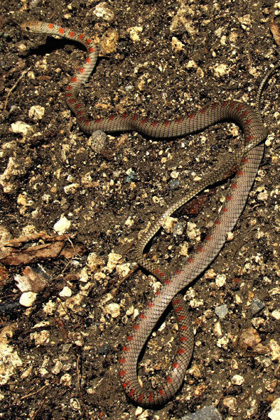 Slender body with long tail; dorsal is black with green spot in each scale with vertebral region of some individuals with row of pink to red spots; pronounced keels present in the green ventral; 77 cm SVL