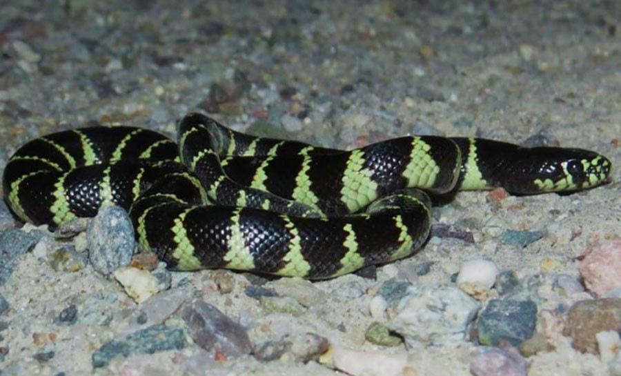 Head and neck: head brown to black, slightly distinct from neck; large white spots on head scales. Body: slender; brown to black with white bands, 2 to 3 scale wide.