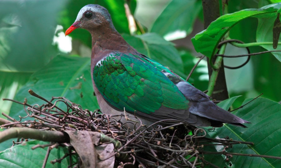 Head and neck: Forehead and stripe over and extending behind eye white (male), white and grey (female); crown and nape bluish grey; neck dark brownish purple; bill red or orange red with purple base.