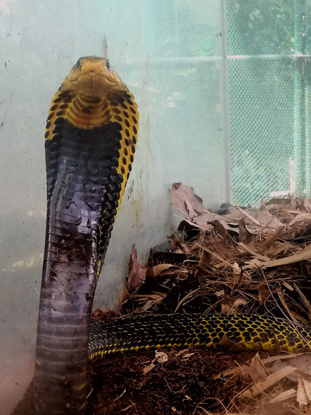 Head and neck: grey to black; head slightly distinct from neck; labials and throat yellow; 1 preocular; 3 postoculars; 7 upper labials, 3rd and 4th in contact with eye; 8 lower labials; able to hood and lift anterior part of the body when threatened;