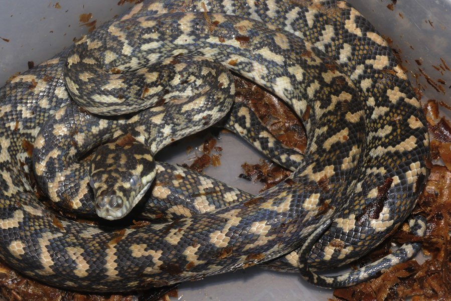 Body: mascular and long; brown with lighter color irregular blotches throughout; some dark scales with brown spots.