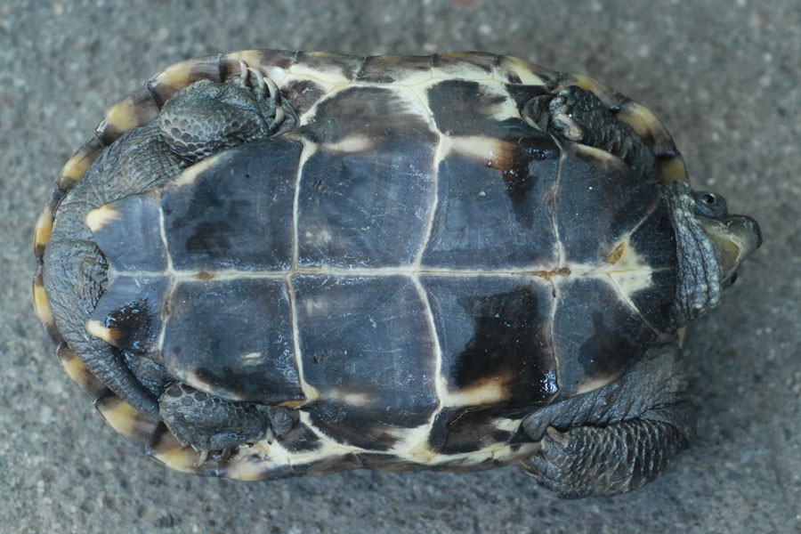 Carapace - light brown to greyish brown; oval and low-arched; three keels that are more or less parallel; no serration in the marginal scutes; adult males tend to become darker with age.
