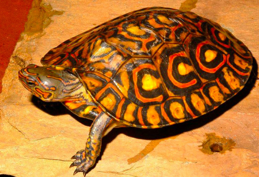 Carapace- brown in color with yellow or red lines or rings; appears rough due to growth rings (annuli); median keel present; serrated posteriorly;