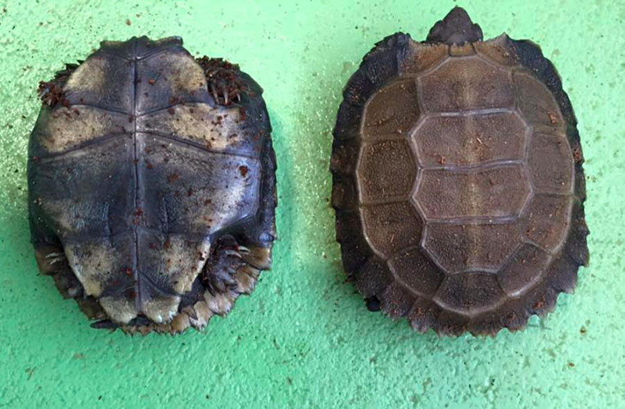 Carapace - round and dome-shaped with scutes curved outwards, growth rings (anuli) present and noticeable on vertebral and costal scutes; black to dark brown in color; small nuchal scute is present; five wide vertebral scutes that are almost equal in length; sides of the first vertebral scute are parallel; second to fourthvertebral scutes are hexagonal in shape; fifth vertebral scute is wider towards the rear; 11 marginal scutes. the supracaudal scutes are divided.