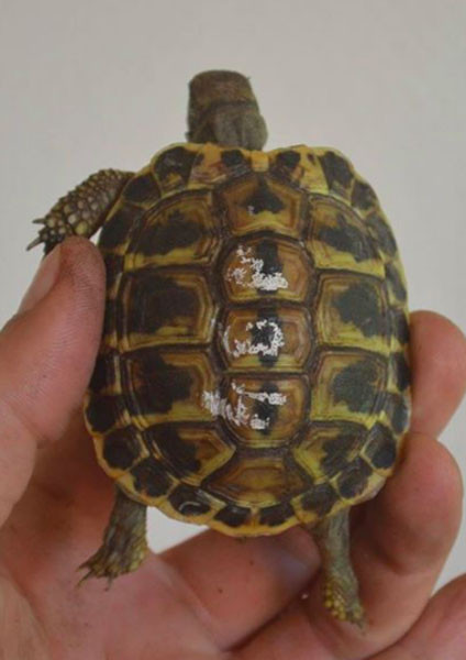 Carapace- yellow, greenish brown, or dark brown with dark blotches; domed with descending sides; longer than broad; highest behind the center; one cervical scute, slight cervical notch; marginals downturned and slightly serrated posteriorly; supracaudal divided
