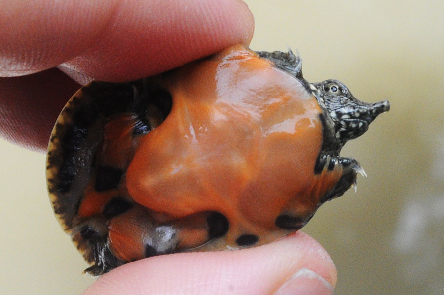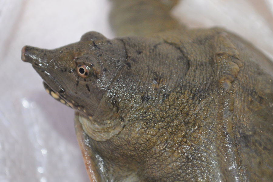 Carapace -oval in shape, longer than wider; front portion of the sides are smooth and do not have tubercles; carapace margin is smooth; greenish to grey in coloration with black ring markings.