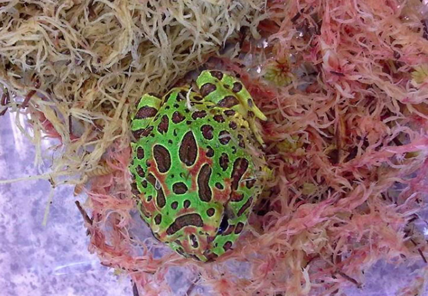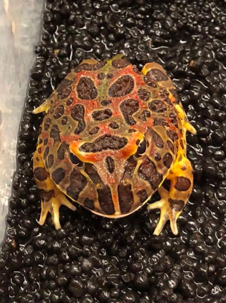Body: green with dark dark brown blotches; almost round in shape when viewed above.