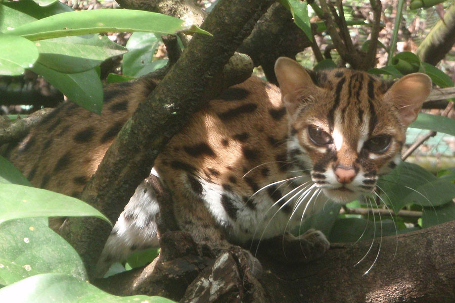 Body: smaller than domestic cats; golden brown fur with brown spots on entire body; abdomen white from chin to the body; main fur coloration varies from light grey to yellowish brown.