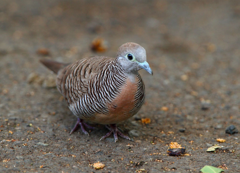 A small dove with long tail; sexes are alike in appearance; 21 cm TL; 50-72 g.                                                          Head and neck: Front of head, cheek, and throat bluish grey; back of head yellowish brown; eye pale blue; bare skin around eye blue; bill blue.