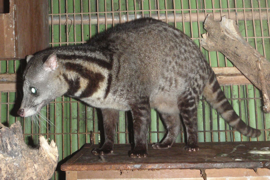 legs usually black; tail with alternating bands of black and nearly white fur; 15 black bands on tail; hindfoot longer than common palm civet, 8.9 to 10.5 cm; tail length 20.9 to 35 cm.