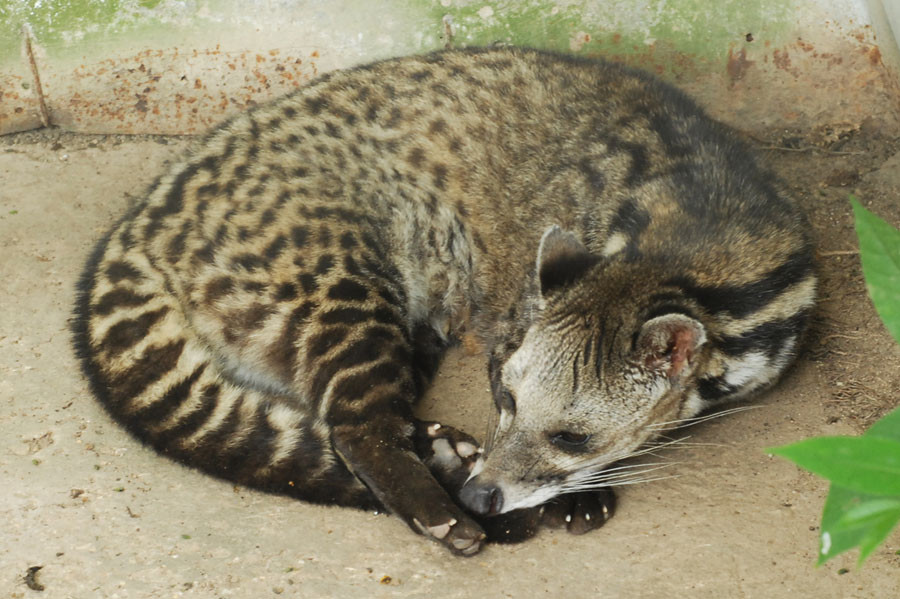 Medium-sized civet; grey brown fur with mixture of stripes and spots; black spots that form rows over the back; a dark line extends along the back and onto the entire length of the tail.
