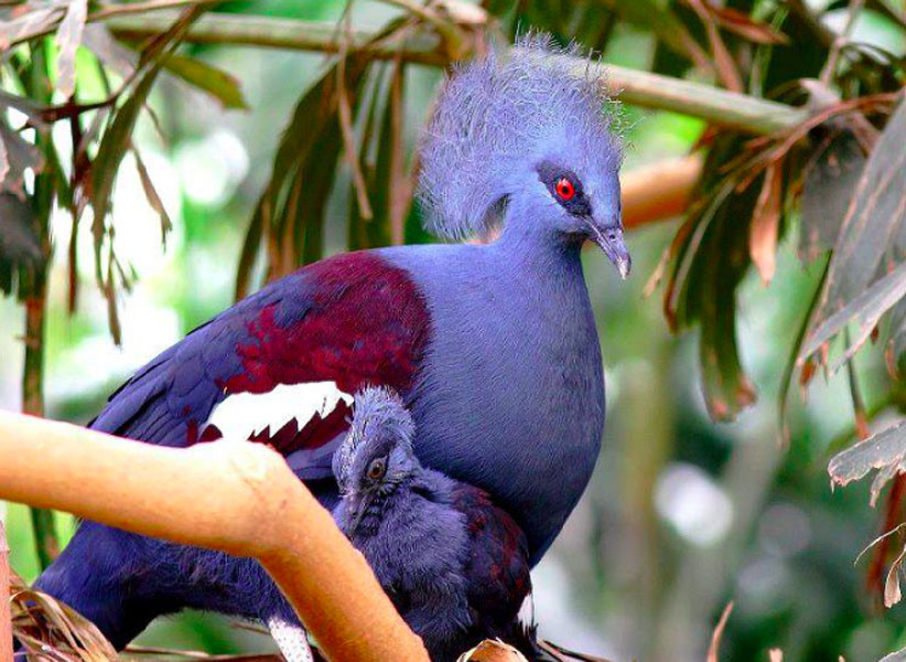 A huge terrestrial pigeon; 61-75 cm; 1800-2400 g; sexes are alike in appearance. Head and neck: Overall coloration is bluish grey; head adorned with laterally compressed pale bluish grey lacy crest; eye red; black stripe from base of bill and through eye terminates behind eye; bill grey; throat black.