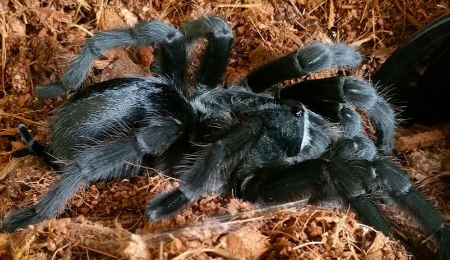 Head and body: heavy-bodied; uniform black. Limbs: femur jet black; rest of the legs appear grey due to setae (hair).