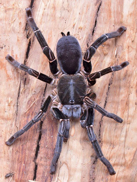 Head and body: brown, grey or black; abdomen oval in shape; no urticating hairs on abdomen Limbs: femur black; rest of legs brown with long setae (hair).