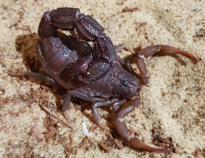 Head and body: uniform dark brown to black; abdomen robust, flattened. Limbs: pedipalp slender, black; tip of chela brown; legs black; metasoma bulbous.
