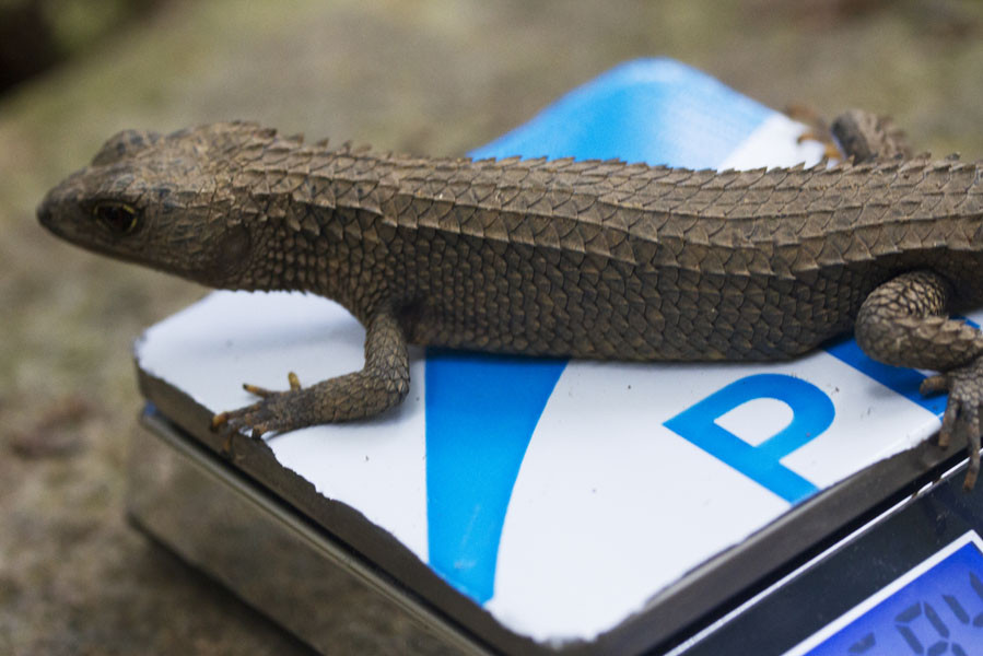 Prominent serrated scales from body towards the tail; serrated scales present in dorsal part of the forelimb and hindlimb; five toes on forelimbs and four toes on hindlimbs.