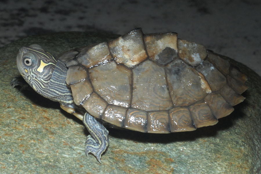Carapace - ground color of brown or greenish olive with an often interrupted, black, mid-dorsal stripe and a network of yellowish lines, usually forming circles or semicircles on the pleurals; the carapace has a median keel accentuated by prominent knobs or blunt spines on the second and third vertebral scute; along its posterior border, the carapace is serrated; straight carapace length = 14 cm (male), 26 cm (female).
