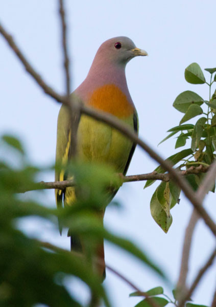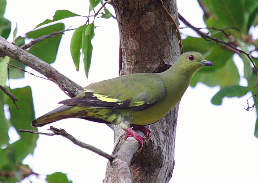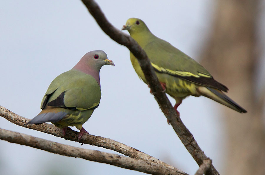 A medium pigeon; 24-30 cm TL; 105-160 g. Head and neck: Forehead, face, and throat greyish green; nape and side of neck greyish pink (male), greyish yellow (female); eye yellow to pink; bill dull green with bluish tip.