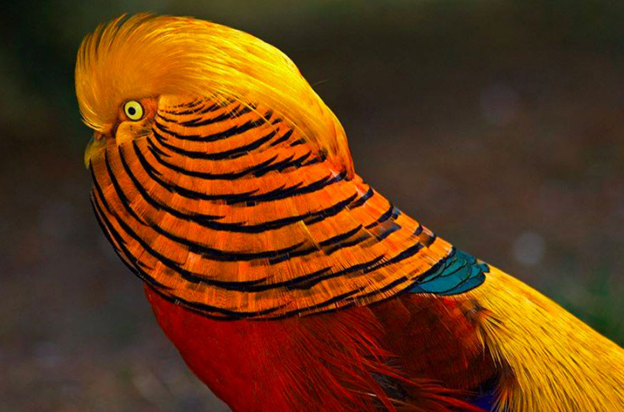 Males with flamboyant plumage and very long tail, females mainly brown with black bars; male 100-115 cm TL; female 61-70 cm TL.                                                           Head and neck: Crown golden yellow; nape and side of neck yellowish orange with black bars; bill light yellowish brown; skin around eye yellow; throat red.