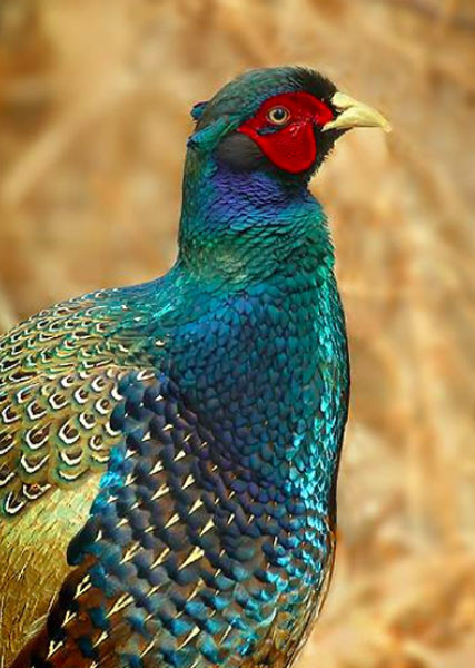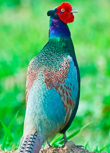 Head and neck: Crest and neck iridescent dark green; face red; bill grey to dull yellow (male).