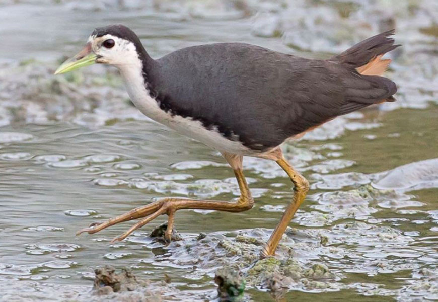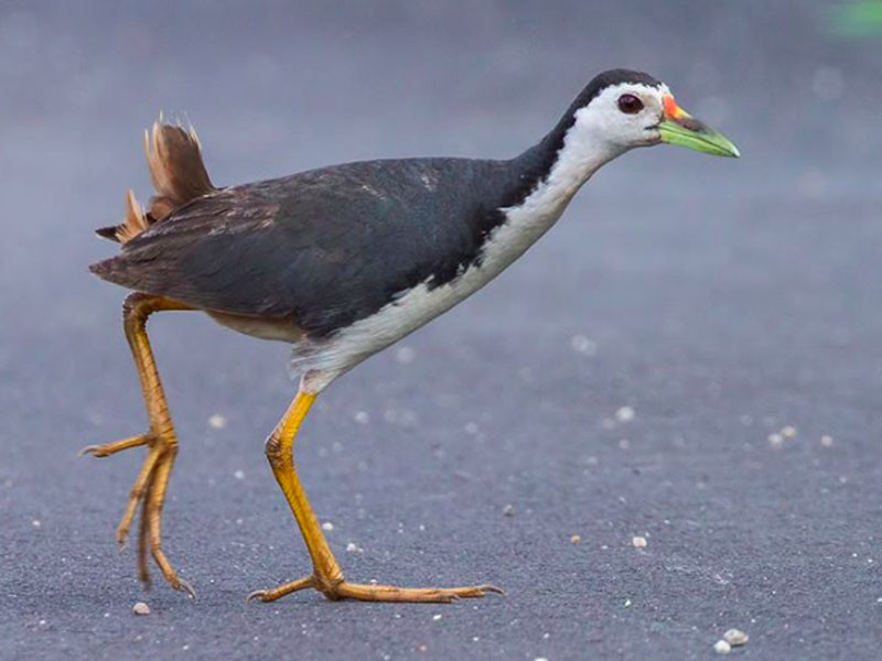 A medium to large water bird; 28-33 cm TL; 166-328 g; sexes are alike in appearance. Head and neck: Forehead, face, and throat white; crown and nape grey; eye dark brown; bill greenish yellow; red spot on the base of top bill.