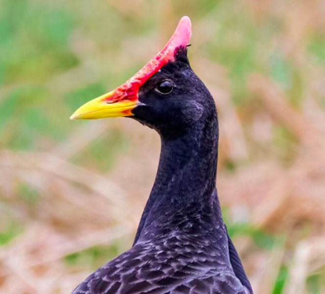 A large water bird; 34-43 cm TL; 200-650 g; males larger.                               Head and neck: Frontal shield and base of  bill red, bill tip yellow; crown dark grey; head and neck grey; eye red.