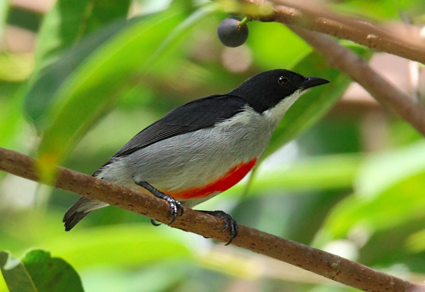 Body: Upper body black with bluish gloss; Lower body greyish white with diagnostic narrow red stripe on breast and abdomen.