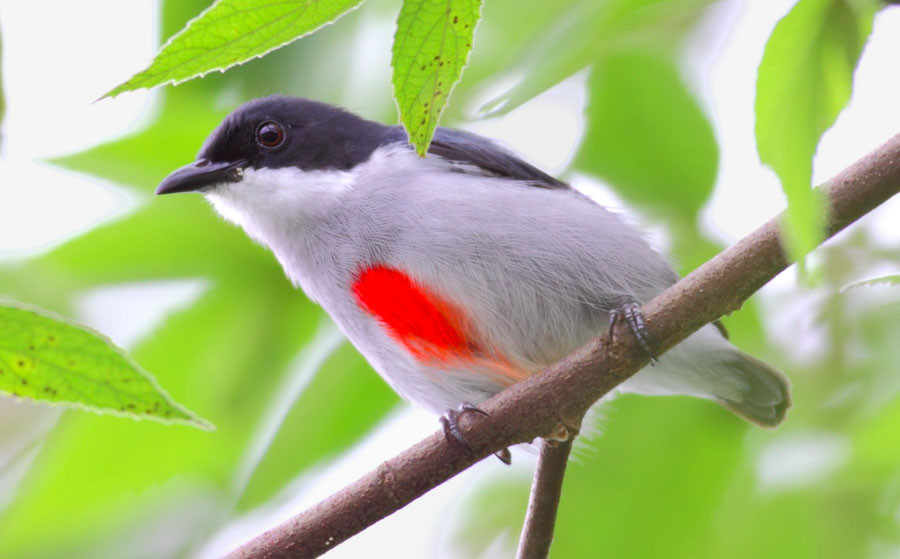 A small bird; 10 cm TL; 9-11g. Head and neck: Head and neck black; eye dark brown; bill black; throat white.