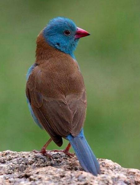 Head and neck: Head light blue (male); crown and nape greyish brown, face light blue (female)l eye brown to red; skin around eye greyish blue; bill pink to red; throat light blue.